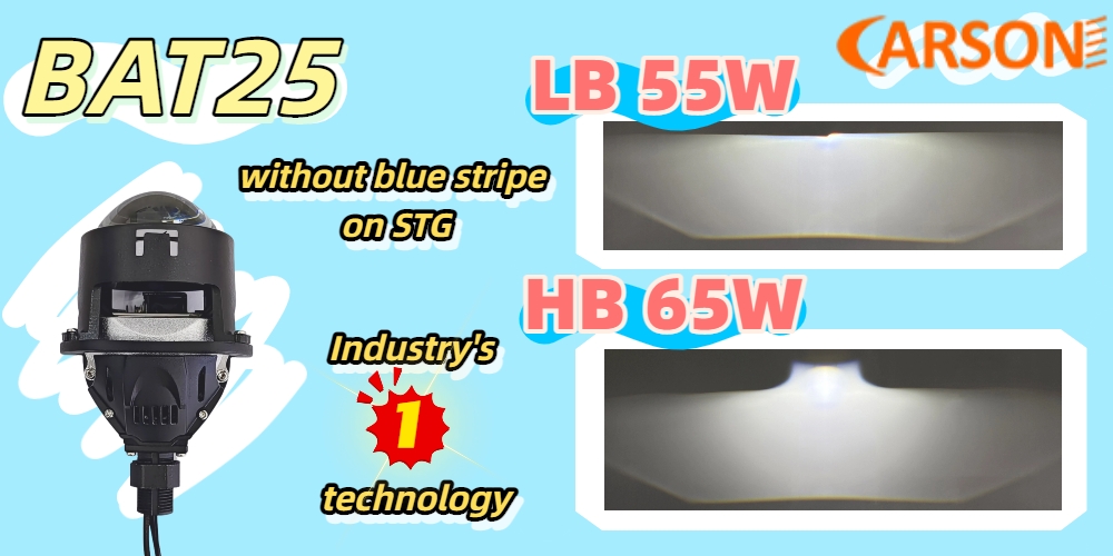 Carson's new dual-reflector lens, the BAT25, delivers a purer, sharper lighting experience without blue stripe on STG. Furthermore, the BAT25's compact size and high performance meet the retrofit and upgrade needs of a wide range of vehicle models.