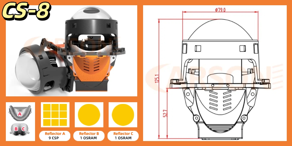 To meet this demand, Carson proudly presents the CS8, one of the most competitive lenses on the market today. With its ultra-compact triple reflector design, advanced optical engineering, and premium materials, the CS8 delivers outstanding brightness, beam width, and durability — making it a true game-changer.